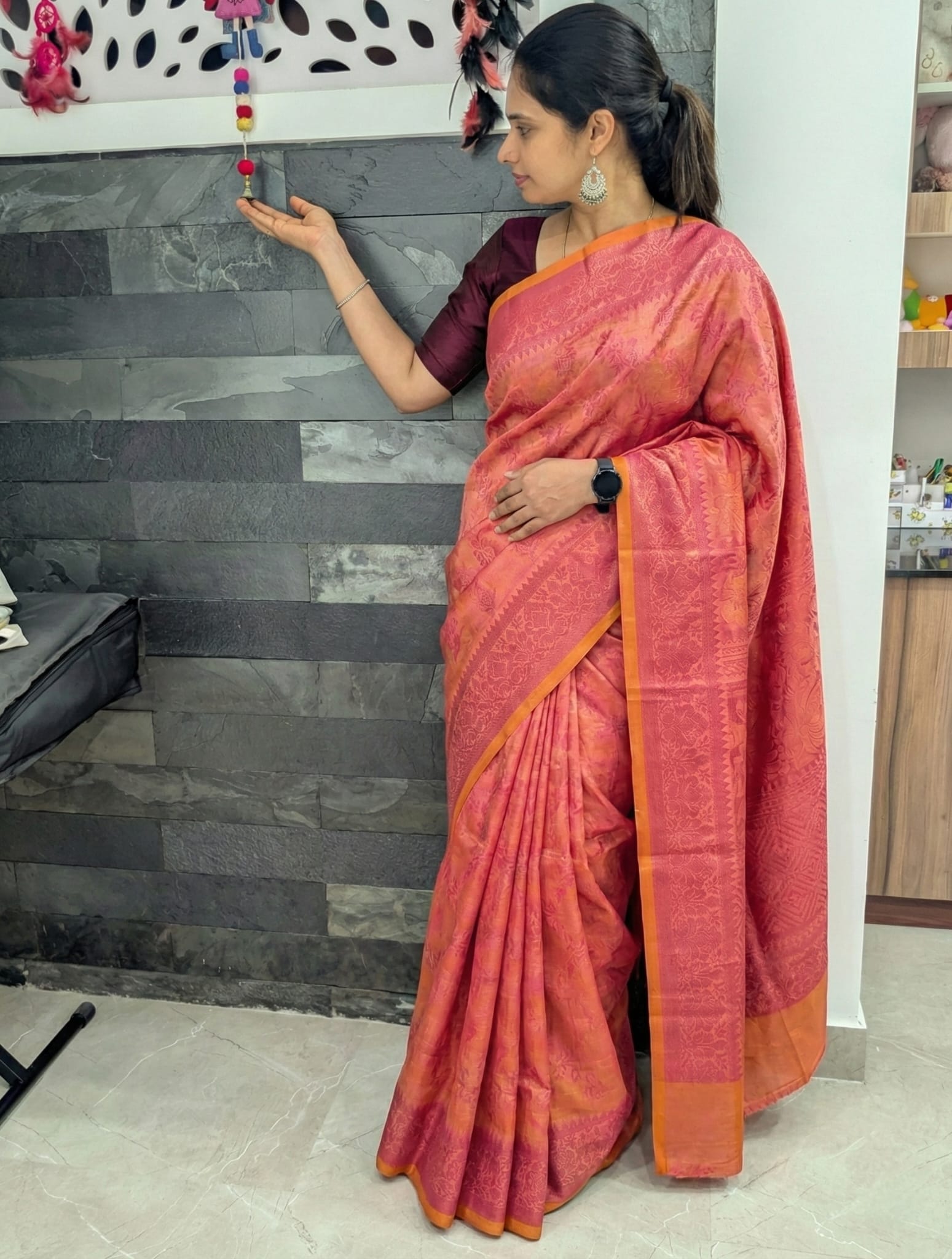 • Sarees may include an unstitched blouse piece. In some designs, the blouse piece may be separate or not attached to the saree.